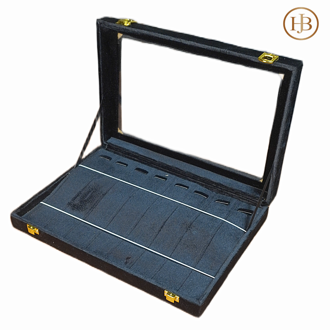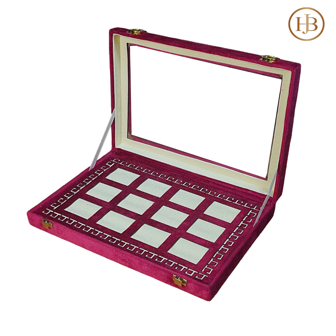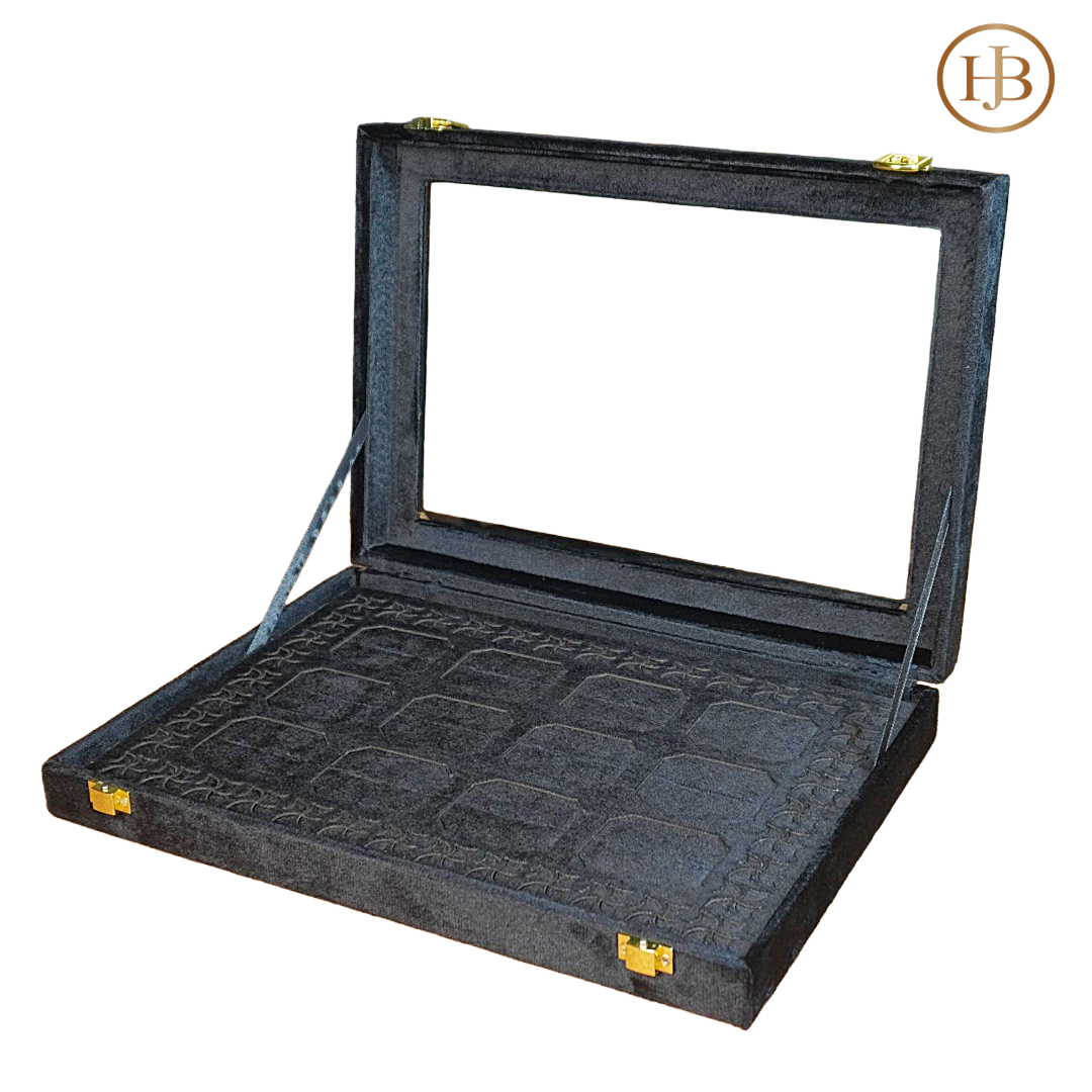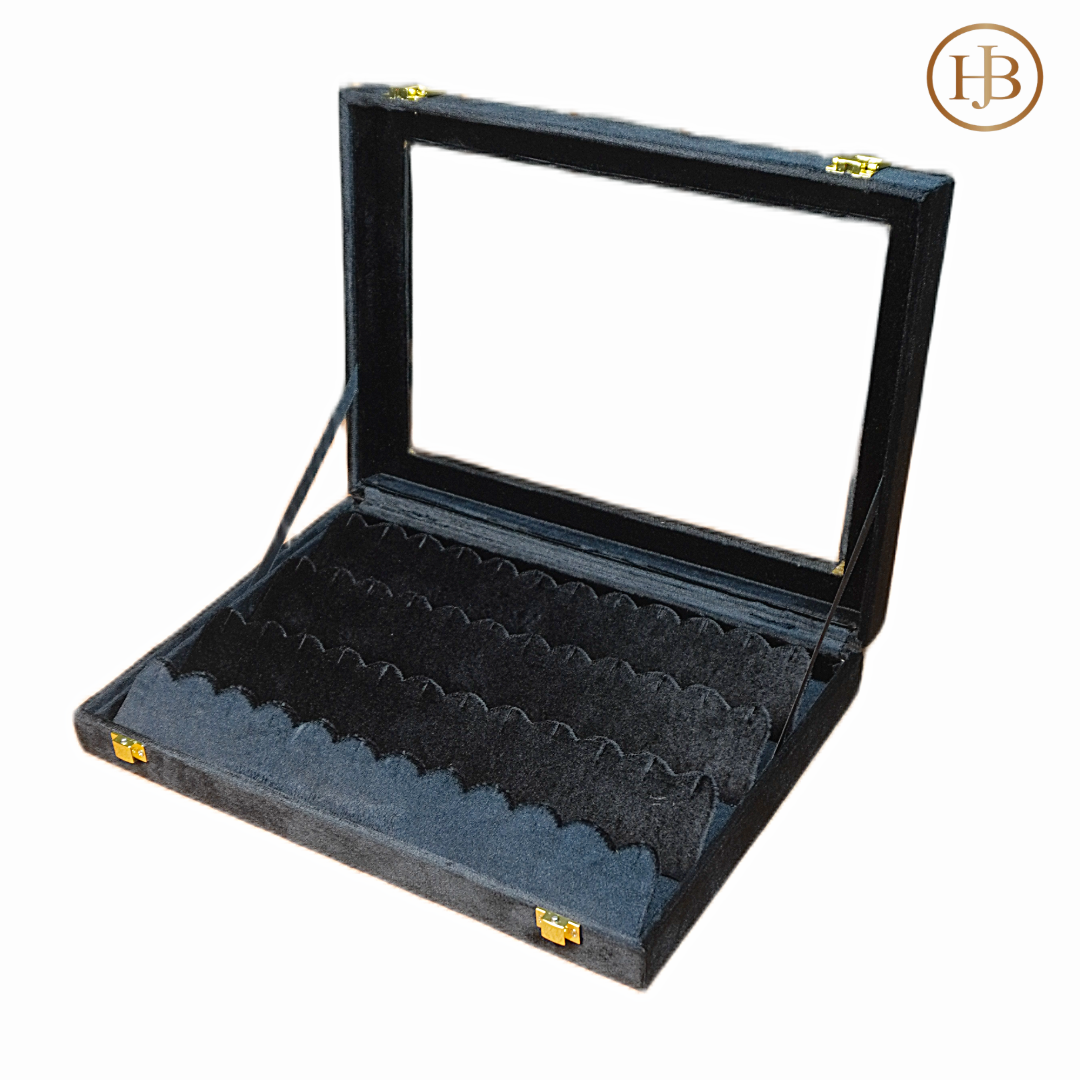 The bold black exterior is paired with a rich red & Black frame and a soft off-white velvet interior, creating a stunning contrast that highlights every piece inside. A built-in top mirror offers convenience for viewing and styling, while the spacious compartments keep rings, earrings, and accessories neatly organized and protected.